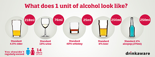 και το αποτέλεσμα είναι πόσες μονάδες (unit) περιέχονται σε αυτό που πίνουμε.Έτσι για παράδειγμα 1 μπουκάλι μπύρας 330ml  και περιεκτικότητα σε αιθανόλη 4% αντιστοιχεί σε 330 x 4/1000=1, 32 μονάδες αλκοόλ.