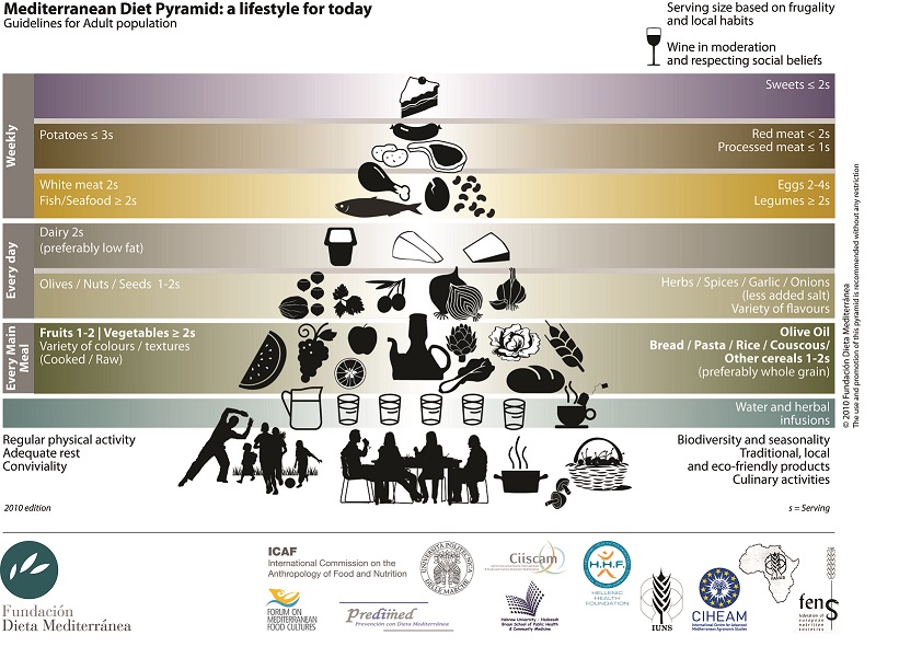 Η παραδοσιακή Μεσογειακή Δίαιτα (Διατροφή) είναι η κληρονομιά χιλιετιών ανταλλαγών ανθρώπων, πολιτισμών και τροφών από το σύνολο των χωρών γύρω από τη λεκάνη της Μεσογείου. Αποτελεί τη βάση διατροφικών συνηθειών. Αποτελεί τη βάση των διατροφικών συνηθειών στον εικοστό αιώνα σε όλες τις χώρες της περιοχής, στηριζόμενη αρχικά σε αγροτικά και γεωργικά μοντέλα. Ωστόσο, στις μέρες μας η παραδοσιακή μεσογειακή δίαιτα πλήττεται από την παγκόσμια διάδοση της δυτικού-τύπου οικονομίας, της αστικής και τεχνολογικά κατευθυνόμενης κουλτούρας όπως και από την παγκοσμιοποίηση της παραγωγής και κατανάλωσης των τροφών, που σχετίζεται με την ομογενοποίηση της διατροφικής συμπεριφοράς στη σύγχρονη εποχή. Από τη σημαντική "Μελέτη των Επτά Χωρών" του 1950 γνωρίζουμε τις τροφές που περισσότερο ή λιγότερο συχνά καταναλώνονταν στη Μεσόγειο, ένα σχήμα διατροφής που ακολουθήθηκε κυρίως από τις φτωχές γεωργικές κοινωνίες. Αυτό μας οδήγησε να ορίσουμε τη Μεσογειακή Δίαιτα (Διατροφή) ως ένα διαιτητικό πρόγραμμα με τα εξής στοιχεία:1.πλούσιο σε φυτικές ίνες (δημητριακά, φρούτα, λαχανικά, όσπρια, ξηροί καρποί, σπόρους και ελιές) με2. ελαιόλαδο, σαν πρωταρχική πηγή πρόσθετου λίπους, μαζί με3. υψηλή έως μέτρια πρόσληψη ψαριών και θαλασσινών-οστρακοειδών και4. μέτρια κατανάλωση αυγών, πουλερικών και γαλακτοκομικών ( τυρί και γιαούρτι),5. χαμηλή πρόσληψη κόκκινου κρέατος και6. μέτρια κατανάλωση αλκοόλ (κυρίως κρασί κατά τη διάρκεια των γευμάτων).Η πρωτοπόρος Μελέτη των Επτά Χωρών και πολυάριθμες και αυξανόμενες πρόσφατες επιδημιολογικές μελέτες αποδεικνύουν τα οφέλη για την υγεία με την υιοθέτηση της Μεσογειακής Δίαιτας , κυρίως όσον αφορά στην ελάττωση του κινδύνου για καρδιαγγειακά νοσήματα, στην ανάπτυξη σακχαρώδη διαβήτη, μεταβολικού συνδρόμου, νεύρο-εκφυλιστικές παθήσεις και καρκίνο.Η δίαιτα αυτή έγινε γνωστή στο ευρύ κοινό από το 1995 με τη χρήση της παγκοσμίου γνωστής “πυραμίδας” που γραφικά αναδεικνύει τις ομάδες τροφών που είναι χρήσιμο να καταναλώνονται ημερησίως, εβδομαδιαίως ή λιγότερο συχνά. Ανάγκη ανανέωσης της δίαιτας αυτής κρίθηκε απαραίτητη τα τελευταία χρόνια λόγω του νέου σύγχρονου τρόπου ζωής, των κοινωνικοοικονομικών, περιβαλλοντικών εξελίξεων και προκλήσεων για την υγεία. Έτσι, με τη συνεργασία επιστημόνων από διάφορους τομείς διατροφολόγων, παθολόγων, ανθρωπολόγων, κοινωνιολόγων και ειδικών σε θέματα γεωργίας-καλλιεργειών κλπ εμπλουτίσθηκε με επιπλέον στοιχεία όπως: -με την επιλογή πλέον όχι μόνο του είδους της τροφής αλλά και της ποιότητας της και ποσότητας αυτής καθώς και -με προσθήκη κοινωνικών και πολιτισμικών στοιχείων από το "μεσογειακό τρόπο ζωής" τα οποία ενσωματώθηκαν στο γράφημα της πυραμίδας και - στον τρόπο επιλογής, μαγειρέματος, κατανάλωσης της τροφήςΑποτελεί μία δίαιτα για τον υγιή ενήλικο πληθυσμό και πρέπει να προσαρμόζεται από τον ιατρό για τα παιδιά, τις εγκύους και για άτομα με συγκεκριμένα προβλήματα υγείας. Η βάση της νέας πυραμίδας αποτελείται και πάλι από τις τροφές που ουσιαστικά “ στηρίζουν” τη δίαιτα και ακολουθούν τα παραπάνω επίπεδα της πυραμίδας με τις τροφές που πρέπει να καταναλώνονται λιγότερο όσο ανεβαίνουμε προς την κορυφή της. Η σύγχρονη Μεσογειακή Δίαιτα συστήνει: Αρχικά, -στη βάση της την κοινωνικοποίηση= σημαντικό κομμάτι για τη κοινωνική και πολιτισμική αξία του γεύματος αποτελεί η “